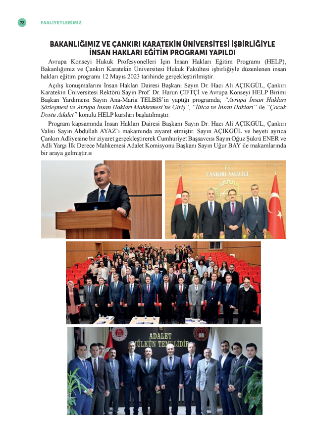 AVRUPA Konseyi Hukuk Profesyonelleri İçin İnsan Hakları Eğitim Programı (HELP) kapsamında Adalet Bakanlığı ile Çankırı Karatekin Üniversitesi Hukuk Fakültesi iş birliğiyle düzenlenen İnsan Hakları Eğitim Programıyla ilgili haber, Adalet Bakanlığı İnsan Hakları Dairesi Başkanlığının yayımladığı İnsan Hakları Dergisinde yer aldı. Mayıs ayında gerçekleştirilen programın açılış konuşmalarını İnsan Hakları Dairesi Başkanı Dr. Hacı Ali Açıkgül, Rektörümüz Prof. Dr. Harun Çiftçi ve Avrupa Konseyi HELP Birimi Başkan Yardımcısı Ana-Maria Telbis’in yapmıştı.