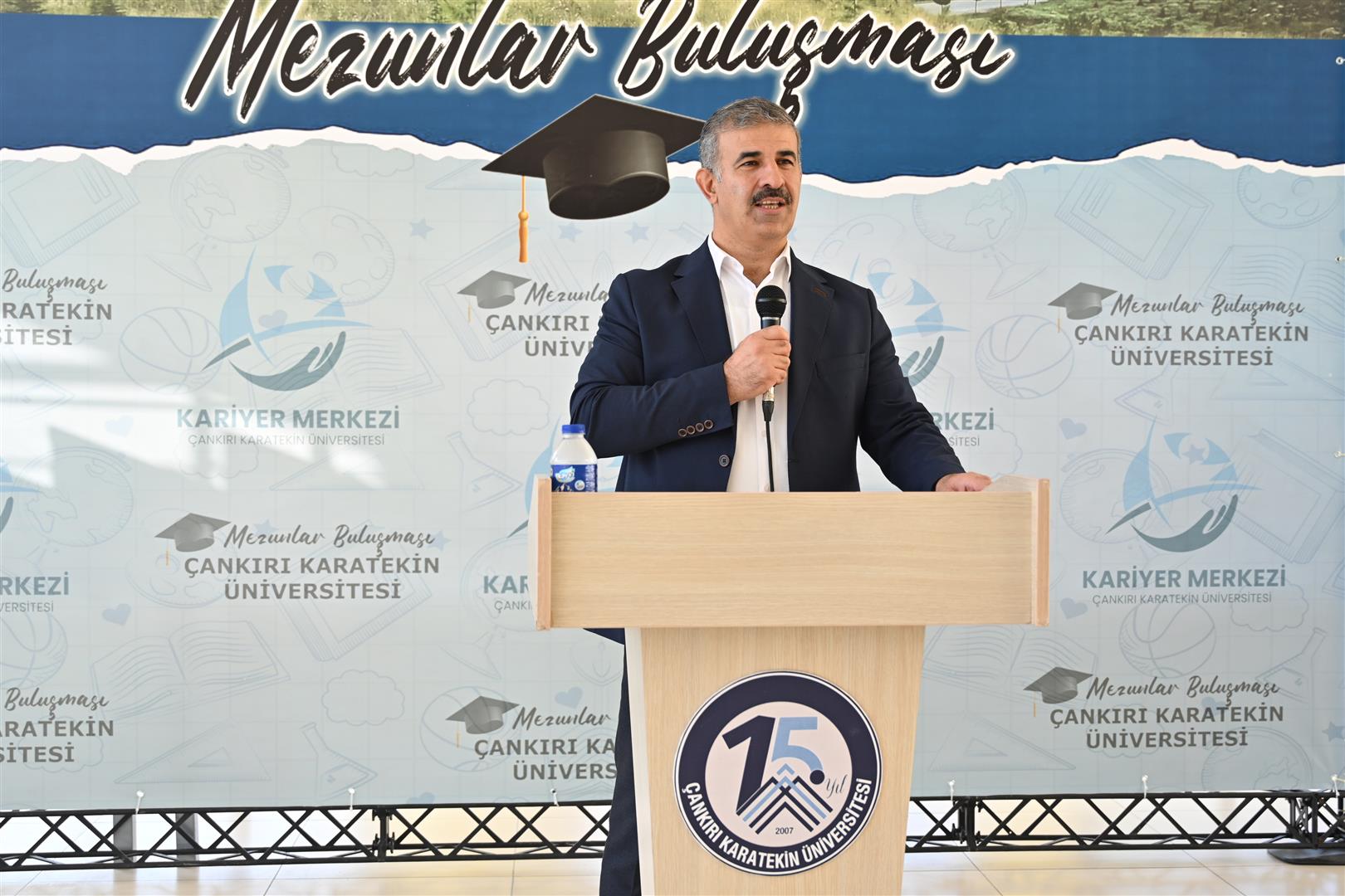 Uluyazı Kampüsümüzde yaşanan değişimlere de değinen Rektör Çiftçi sözlerini şöyle sürdürdü: “Bazılarınız diyeceksiniz ki ‘Evet çok fazla değişim var’. Bazılarınız da diyecek ki ‘Şu ağacın önünde oturup arkadaşlarımızla muhabbet etmiştik, falanca hocamızla şöyle bir diyalogumuz vardı’. Üniversite yılları, hayat boyu akılda kalacak ve anlatılacak anılardır. Üniversite yıllarında edindiğimiz tecrübeler, birikimler hayat boyu bizlere yön gösterecek, bizleri olgunlaştıran tecrübelerdir. Olgunlaşmak ancak bilgiyle meydana gelir. Edindiğimiz bilgiler, kazandığımız deneyimler bizi pozitif yönde tekâmül ettiriyorsa olgunlaşabiliriz. Dolayısıyla bizler, geleceğin yazılımını yapabilmeniz için sizlere kodlar üretiyoruz. Bu kodlarla siz, gelecekte karşılaşacağınız sıkıntılara, sorunlara karşı çözümler üretebiliyorsunuz. Bu sebeplerle Mezunlar Buluşmamız, bizim geçmişle geleceği bir araya getirmemiz adına önemli bir adım oldu. Aynı zamanda bu buluşma, vefa duygusunun gönüllerden meydanlara inmesidir. Gelen misafirlerimize buradan teşekkür ediyorum. Çok güzel yerlerde hizmet ederek Çankırı Karatekin Üniversitesi’ni temsil ediyorlar. Bu bayrağı kendilerinden önce mezun olanlardan aldılar, şimdi de mevcut öğrencilerimize teslim edecekler. İyi ki geldiniz, iyi ki Çankırı Karatekin Üniversitesi’nde buluştunuz, iyi ki ÇAKÜ’lüsünüz. Hepinize sevgi ve muhabbetlerimi sunuyorum.”