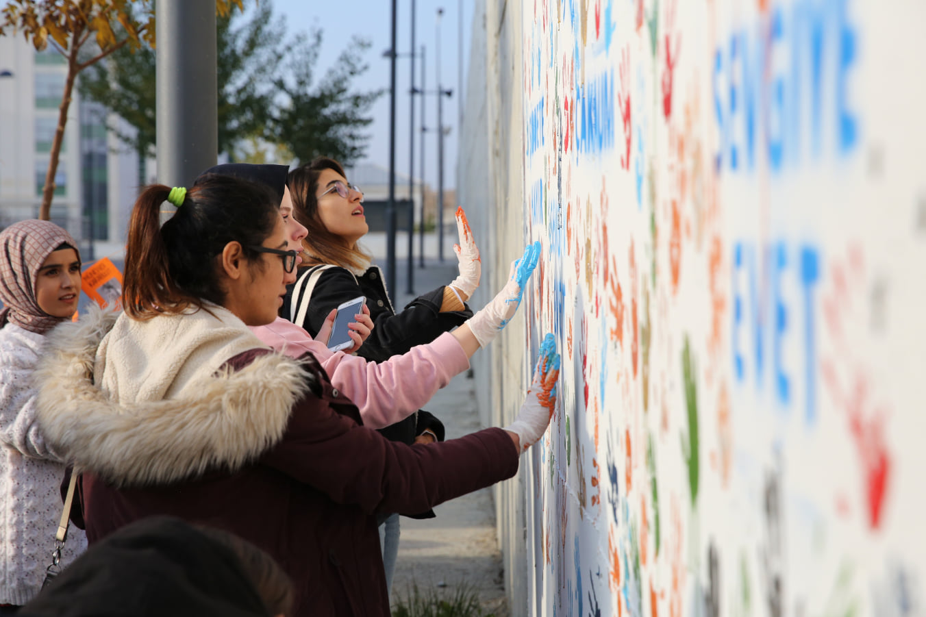 “Kadın, Hukuk, Şiddet” söyleşisinin ardından Sağlık Kültür ve Spor Daire Başkanlığı önünde gerçekleşen “Şiddete El Koyuyoruz” etkinliğinde öğrenciler kendilerine ayrılan duvarı rengârenk el izleri ile doldurdular. Cinayete kurban giden kadınlar anısına, merhum kadınların resim ve bilgilerinin yer aldığı turuncu kartları ağaçlara asan öğrenciler rengârenk balonlarla alanı süsleyerek “şiddete hayır” mesajı verdiler.