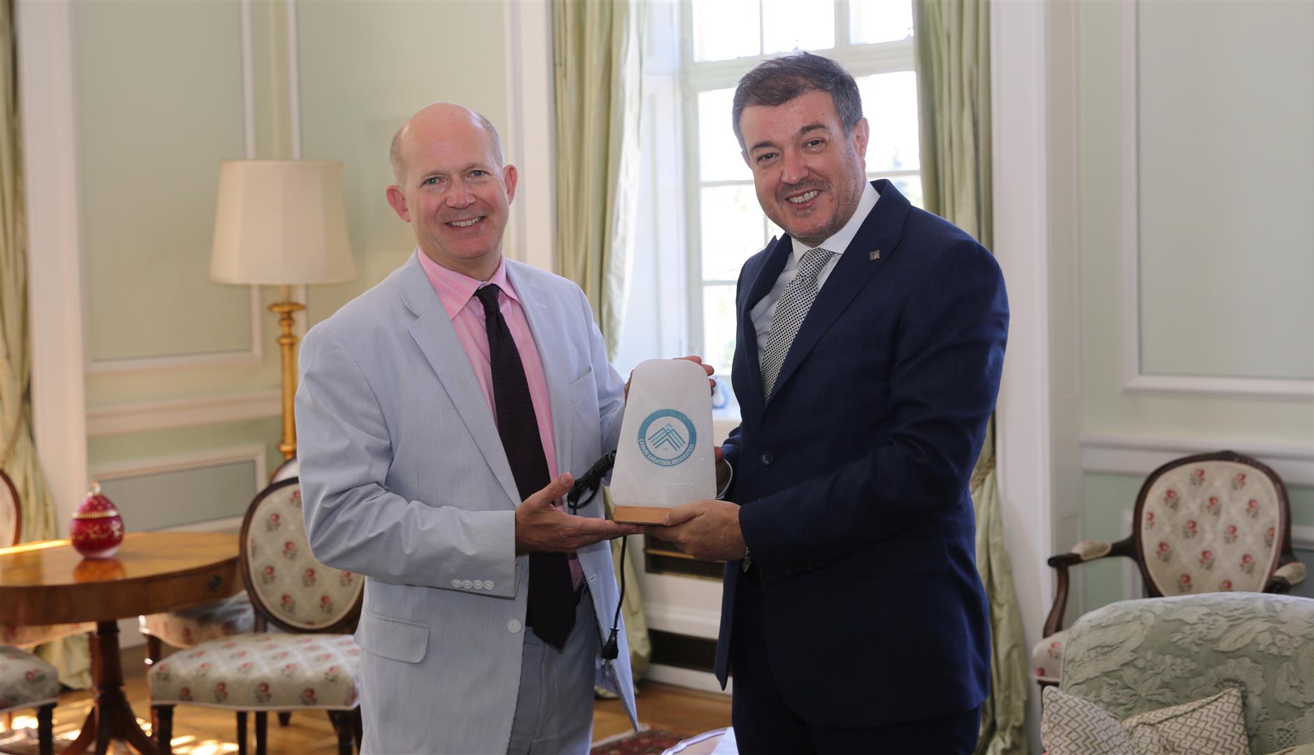 Çankırı Karatekin Üniversitesi Rektörü Prof. Dr. Hasan Ayrancı, Birleşik Krallık Büyükelçisi Sir Dominick Chilcott ile 40 dakikalık bir görüşme gerçekleştirdi. Görüşmede, Rektör Prof. Dr. Hasan Ayrancı büyükelçilik eliyle İngiltere Başbakanı Sayın Boris Johnson’a kültür değeri olan çeşitli hediyeler verdi. Ayrancı, Boris Johnson’a ulaştırılmak üzere Chilcott’a iki sayfalık bir davet mektubu iletti ve kendisini Çankırı Karatekin Üniversitesi’nde görmek istediklerini ifade etti. Sayın Büyükelçi, hediyeleri ve davet mektubunu Başbakan Johnson’a takdim edeceğini ve en kısa zamanda kendisinin de Çankırı’ya gelmek istediğini söyledi. Toplantıda hazır bulunan eğitim uzmanları da Çankırı Karatekin Üniversitesi ile eğitim, araştırma ve personel hareketliliği için hazır olduklarını ve işbirliğinin devam etmesini arzuladıklarını ifade ettiler.