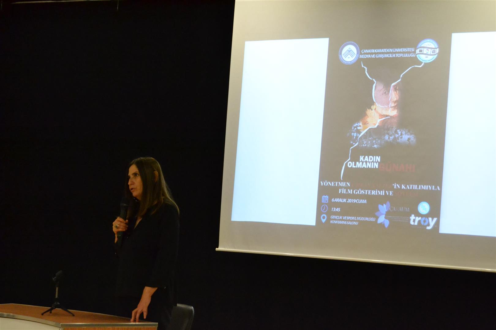 Açılış konuşmasının ardından "Kadın Olmanın Günahı" belgeseli gösterimi gerçekleştirildi. Büyük beğeni toplayan film uzun süre alkışlandı. Gösterimin sonrasında sahneye çıkan Çankırılı yönetmen Ümran SAFTER "Çankırı`dan benimle iletişime geçildiğinde çok mutlu oldum. Nazik davetleri ve düzenledikleri bu program için Medya ve Girişimcilik Topluluğu`na ve Çankırı Karatekin Üniversitesi`nde olmasına çok sevindiğim Kadın Çalışmaları Uygulama ve Araştırma Merkezi`ne çok teşekkür ediyorum. Belgesel türünde filmler çekmek popüler sinemaya göre çok daha meşakkatli oluyor. Kadın Olmanın Günahı filmi sürecinde uzun bir araştırma dönemi gerçekleştirdik. Tarihten bilinçli olarak silinen bir kadının belgelerine ulaşabilmek çok zor oldu. Bu emeklerin gençler tarafından değer görmesi, üniversite öğrencilerimizin gösterim talepleri bizleri en çok memnun eden şey. Tüm filmlerimizi festivaller dışında üniversitelerde gösterime veriyor ve bundan memnuniyet duyuyoruz." dedi.