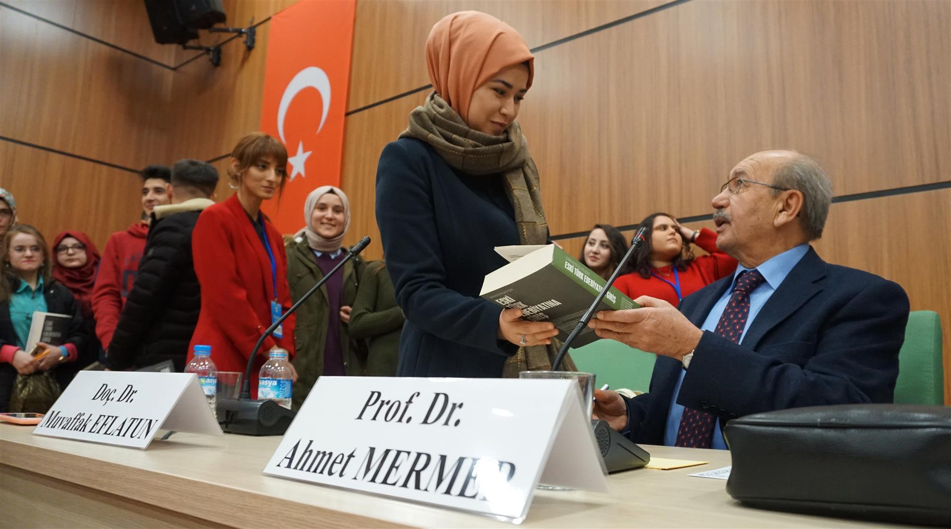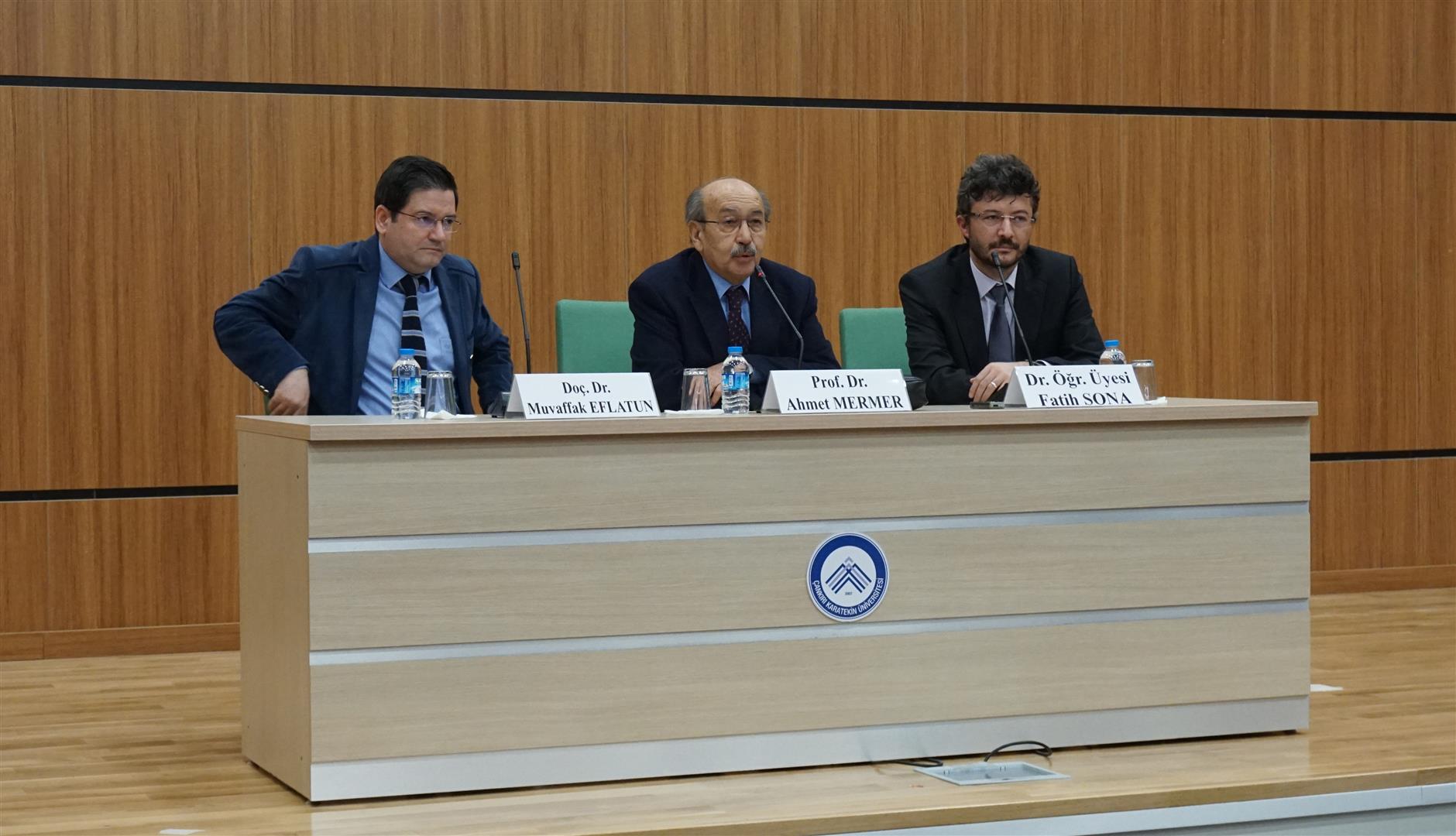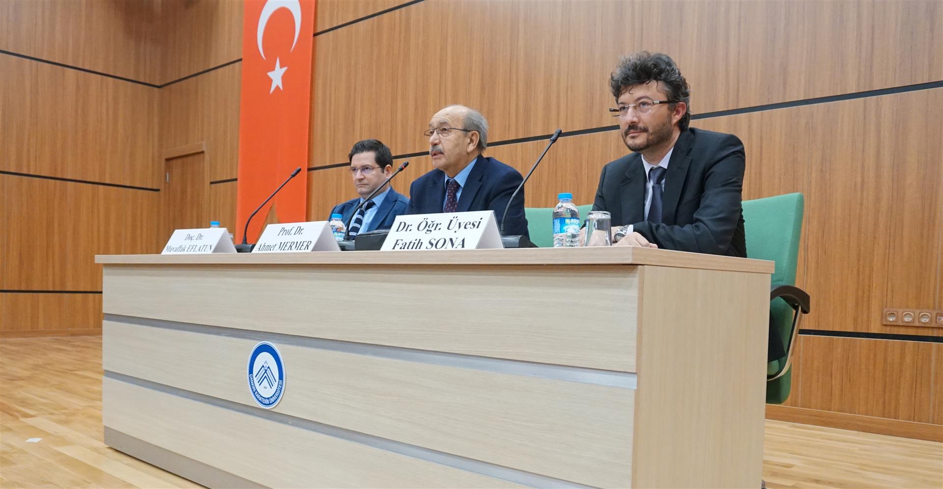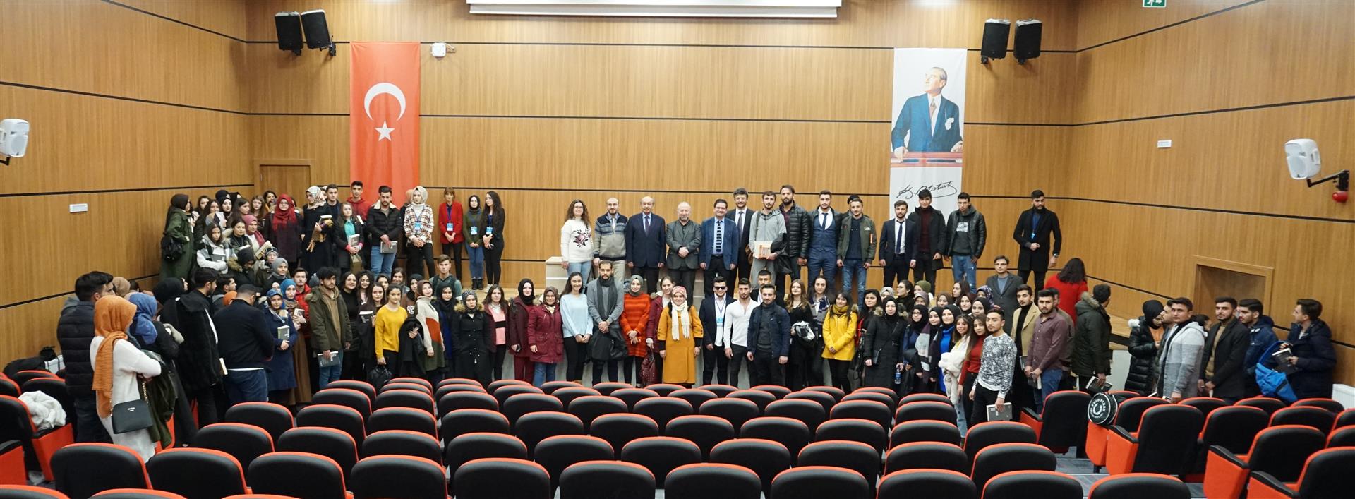 Çankırı Karatekin Üniversitesi Türk Edebiyatı Topluluğu tarafından organize edilen, Prof. Dr. Ahmet Mermer, Doç. Dr. Muvaffak Eflatun ve Dr. Öğr. Üyesi Fatih Sona’nın konuşmacı olduğu panel, İslami İlimler Konferans Salonunda gerçekleştirildi. Saygı duruşunda bulunulması ve İstiklal Marşının okunması ile başlayan programın açılış konuşmasını gerçekleştiren Türk Edebiyatı Topluluğu Başkanı Beyazıt Çağrı Yurdagül, bir buçuk ayda kurulan bir topluluk olmalarına rağmen hızlı bir şekilde programlar düzenlediklerini belirterek katılımcılara teşriflerinden ötürü teşekkür etti. Prof. Dr. Ahmet Mermer’in biyografisinin okunmasının ardından konuşan Dr. Öğr. Üyesi Fatih Sona, Türk Dili Edebiyatı Bölümü ve Topluluğu olarak amaçlarının bir kültür oluşturmak olduğunu söyledi. Ankara’ya en yakın şehirlerden birinin Çankırı olduğunu ifade eden Sona, Klasik Türk Edebiyatı ile ilgili genel bilgiler verdi. Sona’dan sonra konuşmasına başlayan Prof. Dr. Ahmet Mermer, 2 yıllık emeklilikten sonra öğrencilerle bir araya geldiği için oldukça mutluluk duyduğunu ifade etti. İnsanın yaratılış gereği, iyiyi ve doğruyu arayan bir varlık olduğunu söyleyen Mermer, Cemil Meriç’in "Muhteşem bir maziyi daha muhteşem bir istikbale bağlayacak bir köprü olmak isterdim." sözünü örnek vererek sevginin bağlayıcılığının altını çizdi. Türk Dili ve Edebiyatı`nın da bir köprü olduğunu söyleyen Mermer, konuşmasında Mehmet Akif Ersoy ve Yahya Kemal Beyatlı’nın şiir ve hayata bakışından örnekler verdi. Doç. Dr. Muvaffak Eflatun, Klasik Türk Edebiyatı`nın, Batı Medeniyeti ve İslam Medeniyeti kavramları çerçevesinde değerlendirmesi gerektiğini söyledi. Batı Medeniyetinin sanatta yansıtma kuramından devam ettiğini ve bu kuram üzerinden beslendiğini ifade eden Eflatun, İslam Medeniyetinde ortaya çıkan edebî anlayışın soyutlama kavramı üzerine oturduğunu sözlerine ekledi. Program sonunda katılımcılara sertifika ve hediye takdimi gerçekleştirildi.