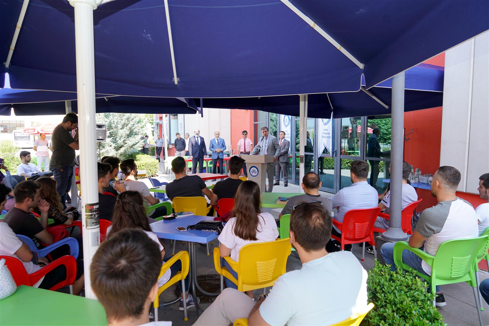 “Her bir arkadaşı çok doğru ve isabetli birimlere yönlendirmişler. Listeye baktım ve aranızda pek çok hukukçu olduğunu da gördüm. Kendim de bir hukuk profesörüyüm. Hukukçuları, hukuk müşavirliğine; elektrik-elektronik mühendislerini, bilgi işlem daire başkanlığına ve diğer arkadaşları da yine kendi bölümlerine uygun yerlere yönlendirmişler. Bizim İŞKUR ile yapmış olduğumuz çalışmayı hayata geçirenler gerçekten olağanüstü düşünmüşler. Bu program Cumhurbaşkanlığımızın birinci yüz günlük eylem planında vardı. Program ile öğrencilerimizin çalışma hayatını tanımaları, kendilerini hem mesleki hem de insani olarak geliştirmeleri düşünülmüştür. Şuan burada 70 öğrencimiz var. Bu, gerçekten gurur verici bir tablo. Hukuk Fakültesi’nden Mühendislik Fakültesi’ne ve Güzel Sanatlar Fakültesi’ne kadar birçok farklı alandan burada bulunan arkadaşımız var. Haftada 3 gün olmak üzere, 3 ay boyunca çalışarak gerçek hayatla temas edecekler. Bu çalışma sürecinde, her bir öğrencimiz kendi alanındaki görünenin arka planında işlerin nasıl yürüdüğünü görecek. Bu projenin çok olağanüstü ve yararlı bir proje olduğunu bir kez daha altını çizerek belirtmek istiyorum. Hem sizi hem de bu projenin geliştirilmesinde il müdürlüğümüzden genel müdürlüğümüze kadar emeği geçen ve katkısı olan herkesi tebrik ediyorum. Sizlere bu süreçte uygun çalışma ortamları temin edebilmek için bazı planlamalar yapılarak bizlere de yazılı olarak bildirildi. Mesela doğanın korunması, kültürel mirasın korunması, kütüphanelerin bakımı ve düzeni, kamu kurumlarının kültürel ve sosyal hizmetlerinin desteklenmesi gibi amaçlar doğrultusunda sizler burada görevlendirildiniz. Umarım huzurlu ve rahat bir ortamınız vardır. Sorunlarınız olursa da ben dâhil tüm çalışma arkadaşlarımızla sorun çözücü olarak buradayız. Öğrenci odaklı bir üniversiteyiz. Bizim ilk önceliğimiz; öğrencilerimiz, sonra akademik personelimiz, daha sonra idari personelimiz ve en son ise yönetim kadromuzdur. Nerede sorun var ise elimizden geldiği ölçüde çözmeye çalışıyoruz. Daha iyi ne yapabiliriz diyerek kendimizi geliştiriyoruz. Aramızda olduğunuz ve buraya katıldığınız için hepinize ayrı ayrı teşekkür ediyor, bu 3 aylık sürecin geri kalan kısmında hepinize başarılar diliyorum.”