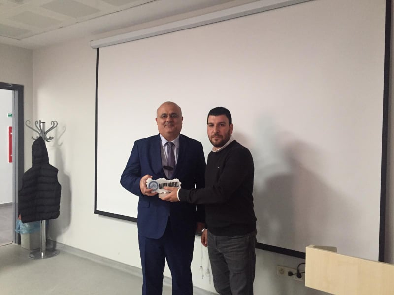 Soru-cevap kısmı ile devam eden söyleşinin sonunda Yüksekokul Müdürü Dr. Öğretim Üyesi Mikail Kara, Burak Mörekli`ye tuz lambası hediye etti.