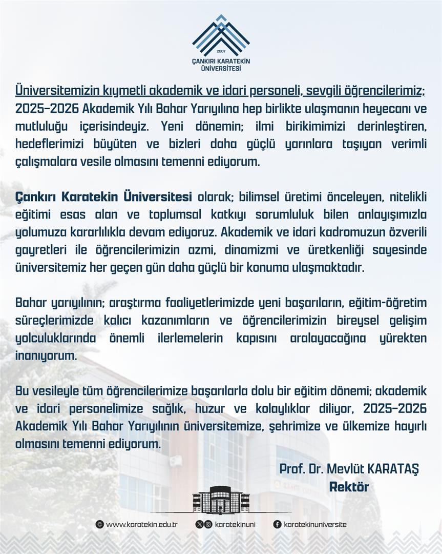 Üniversitemizin kıymetli akademik ve idari personeli, sevgili öğrencilerimiz;2025–2026 Akademik Yılı Bahar Yarıyılına hep birlikte ulaşmanın heyecanı ve mutluluğu içerisindeyiz. Yeni dönemin; ilmi birikimimizi derinleştiren, hedeflerimizi büyüten ve bizleri daha güçlü yarınlara taşıyan verimli çalışmalara vesile olmasını temenni ediyorum.