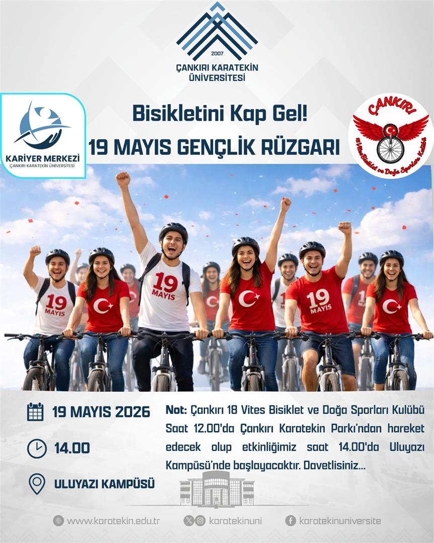 Çankırı Karatekin Üniversitesi Kariyer Merkezi koordinatörlüğünde ve Çankırı 18 Vites Bisiklet ve Doğa Sporları Kulübü iş birliğiyle; 19 Mayıs Atatürk’ü Anma, Gençlik ve Spor Bayramı kutlamaları kapsamında üniversitemiz bünyesinde “19 Mayıs Gençlik Rüzgarı” etkinliği icra edilecektir.Gençlerimizin fiziksel aktivite alışkanlıklarını pekiştirmek ve bayram coşkusunu üniversitemiz yerleşkesine taşımak amacıyla düzenlenen bu organizasyon, şehir merkezinden kampüs alanına uzanan anlamlı bir sürüş rotasını kapsamaktadır.Etkinlik Takvimi ve Güzergâh Bilgileri:Tarih: 19 Mayıs 2026Toplanma Noktası ve Hareket: Katılımcılar saat 12.00’de Çankırı Karatekin Parkı’nda bir araya gelerek toplu sürüşü başlatacaktır.Varış ve Program Başlangıcı: Bisiklet kortejinin varış noktası olan Uluyazı Kampüsü’nde, saat 14.00 itibarıyla ana etkinlik programı gerçekleştirilecektir. "Bisikletini Kap Gel!" çağrısıyla düzenlenen bu anlamlı buluşmaya; tüm akademik ve idari personelimiz, kıymetli öğrencilerimiz ve bisiklet sporuna gönül veren tüm vatandaşlarımız davetlidir.