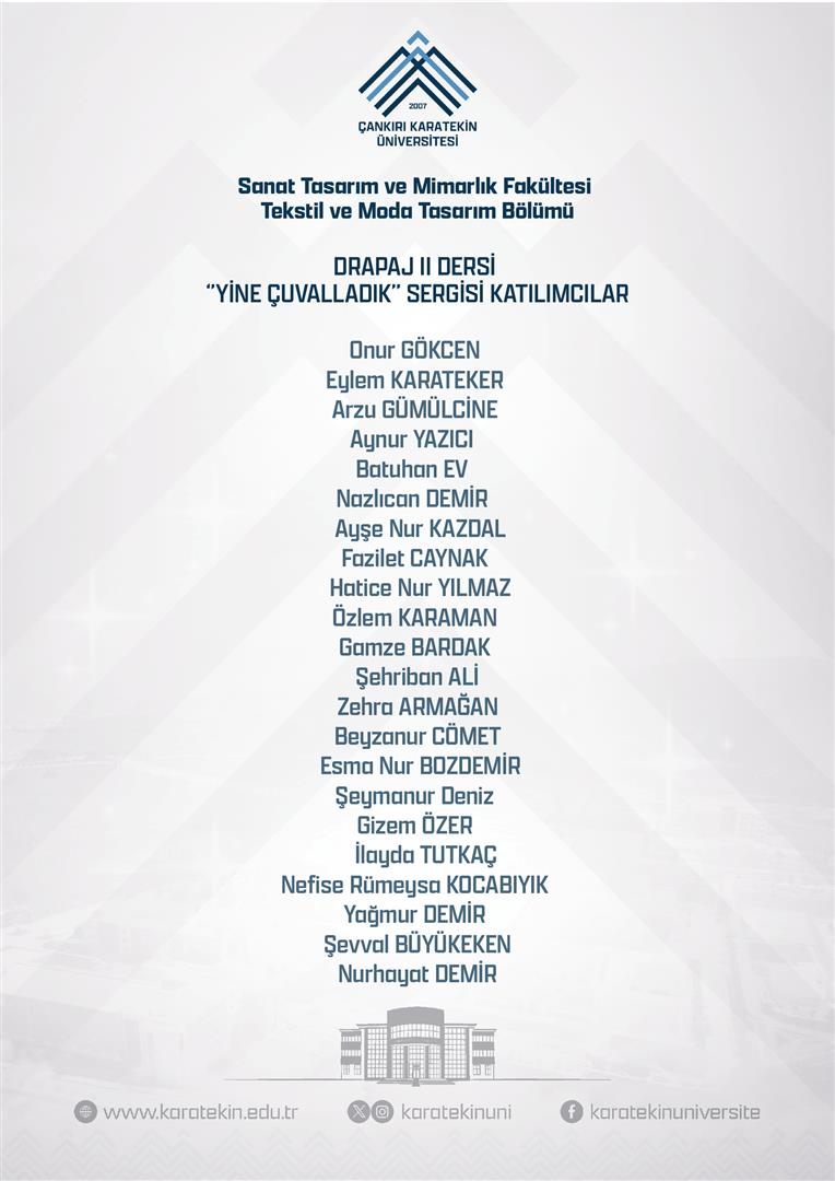 Çankırı Karatekin Üniversitesi Sanat Tasarım ve Mimarlık Fakültesi, Tekstil ve Moda Tasarımı Bölümü öğrencilerinin Drapaj II dersi kapsamında gerçekleştirdikleri çalışmalar, 31 Aralık 2025 günü saat 12.30’da Uluyazı kampüsü öğretim elemanları yemekhane katında açılacaktır.“Yine Çuvalladık” adıyla açılacak sergide, “Çuval giyse yakışır” mottosuyla çuvaldan hazırlanan deneysel drapaj çalışmaları yer alacaktır.
