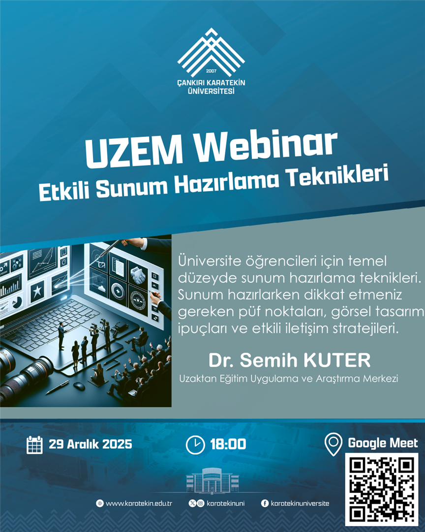 Uzaktan Eğitim Uygulama ve Araştırma Merkezi olarak, üniversite öğrencilerimize yönelik özel bir webinar düzenliyoruz: “Etkili Sunum Hazırlama Teknikleri”. Bu çevrimiçi etkinlikte, temel düzeyde sunum hazırlama teknikleri, sunum hazırlarken dikkat etmeniz gereken püf noktaları, görsel tasarım ipuçları ve etkili iletişim stratejileri üzerinde durulacak.Tarih ve Saat:29 Aralık 2025 Pazartesi18:00Konuşmacı:Doç. Dr. Semih Kuter