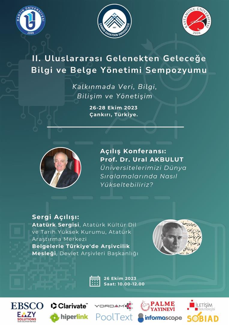 Cumhuriyetimizin kuruluşunun 100. senesinin kutlandığı 26-28 Ekim 2023 tarihleri arasında Çankırı Karatekin Üniversitesi Bilgi ve Belge Yönetimi Bölümü, Bartın Üniversitesi Bilgi ve Belge Yönetimi Bölümü ve Kastamonu Üniversitesi Bilgi ve Belge Yönetimi Bölümü iş birliğiyle “2. Uluslararası Gelenekten Geleceğe Bilgi ve Belge Yönetimi Sempozyumu” Çankırı Karatekin Üniversitesi’nin ev sahipliğinde düzenlenecektir.