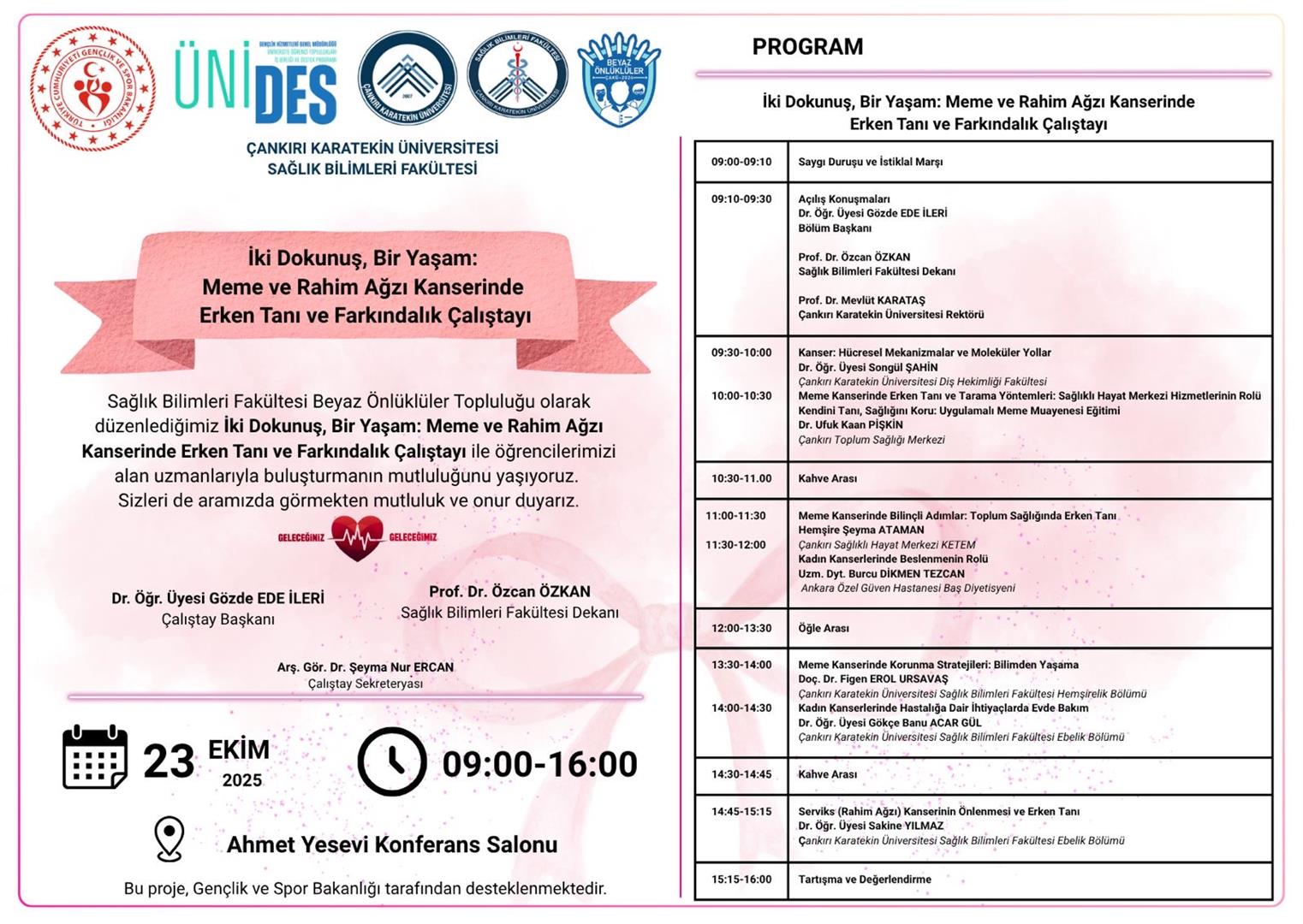Sağlık Bilimleri Fakültesi Beyaz Önlüklüler Topluluğu olarak düzenlenen, Gençlik ve Spor Bakanlığı tarafından ÜNİDES projesi kapsamında desteklenen, İki Dokunuş, Bir Yaşam: Meme ve Rahim Ağzı Kanserinde Erken Tanı ve Farkındalık Çalıştayı ile öğrenciler alan uzmanlarıyla buluşuyor.