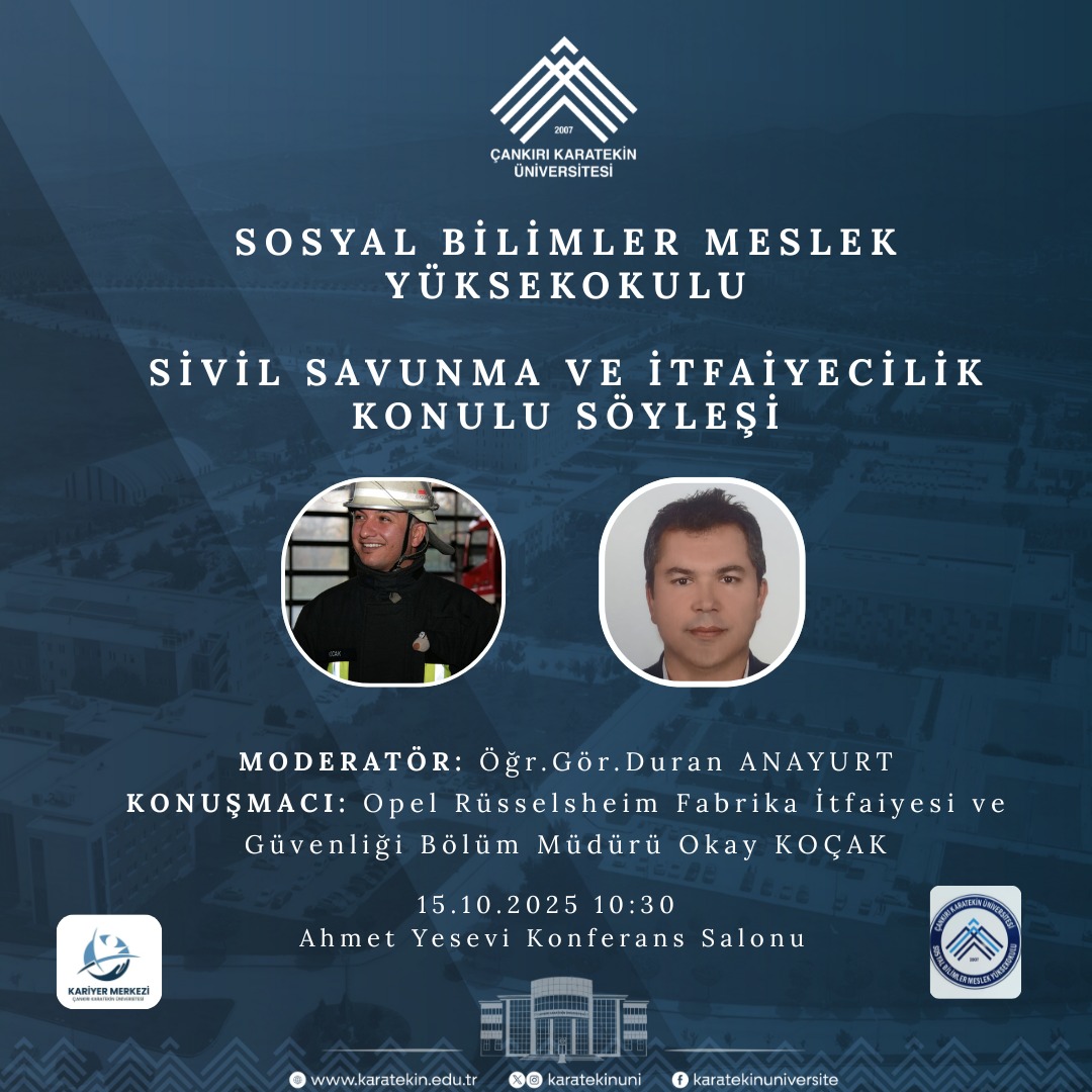 ÇAKÜ Kariyer Merkezi tarafından Öğr. Gör. Duran ANAYURT`un moderatörlüğünde Opel Russelsheim Fabrika İtfaiyesi ve Güvenliği Bölüm Müdürü Okay KOÇAK`ın konuşmacı olarak katılacağı söyleşiye tüm Çankırı Karatekin Üniversitesi mensupları davetlidir.Tarih: 15.10.2025Saat: 10.30Yer: Ahmet Yesevi Konferans Salonu
